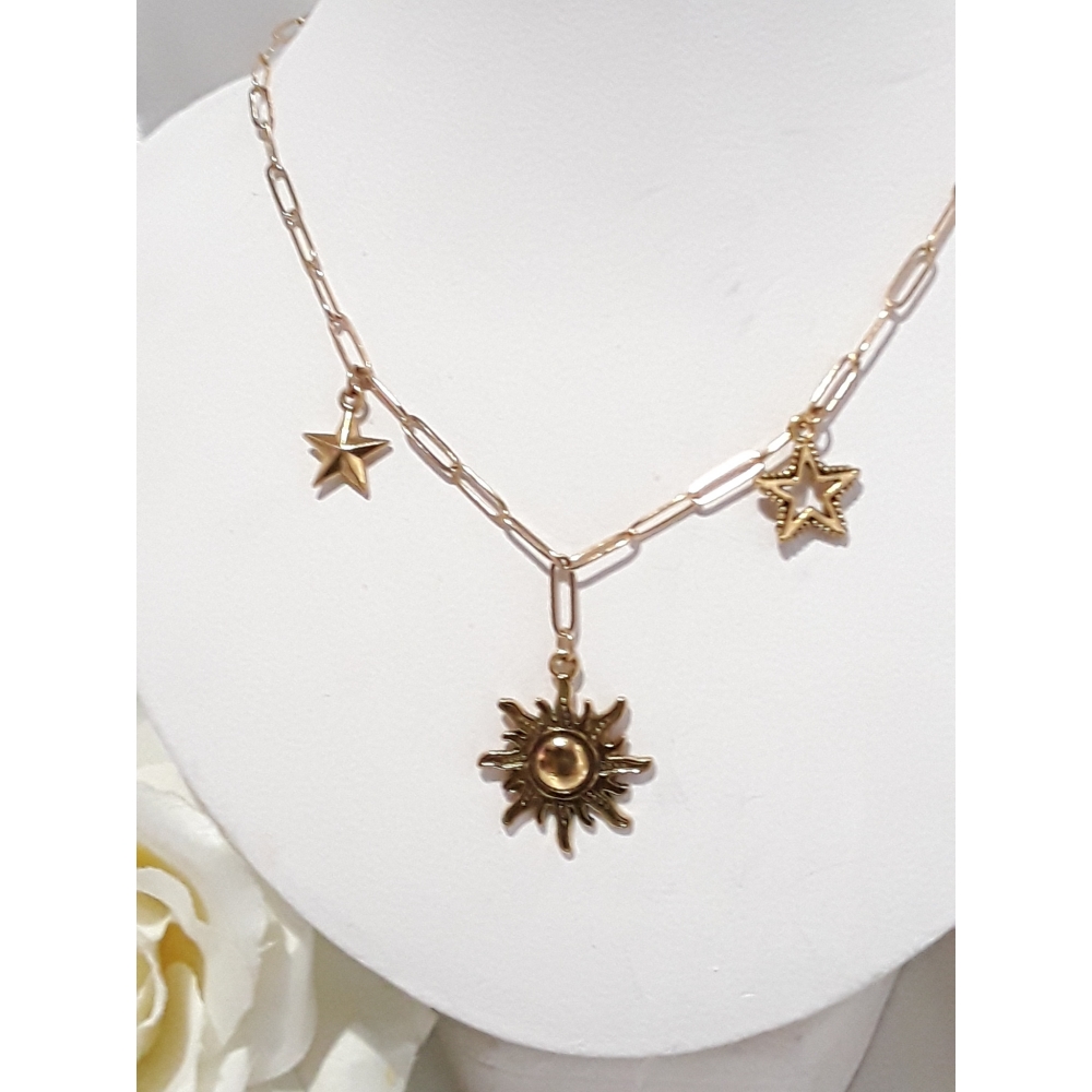 Collier chaine en acier inoxydable doré et ses breloques soleil et étoiles doré en alliage de zinc